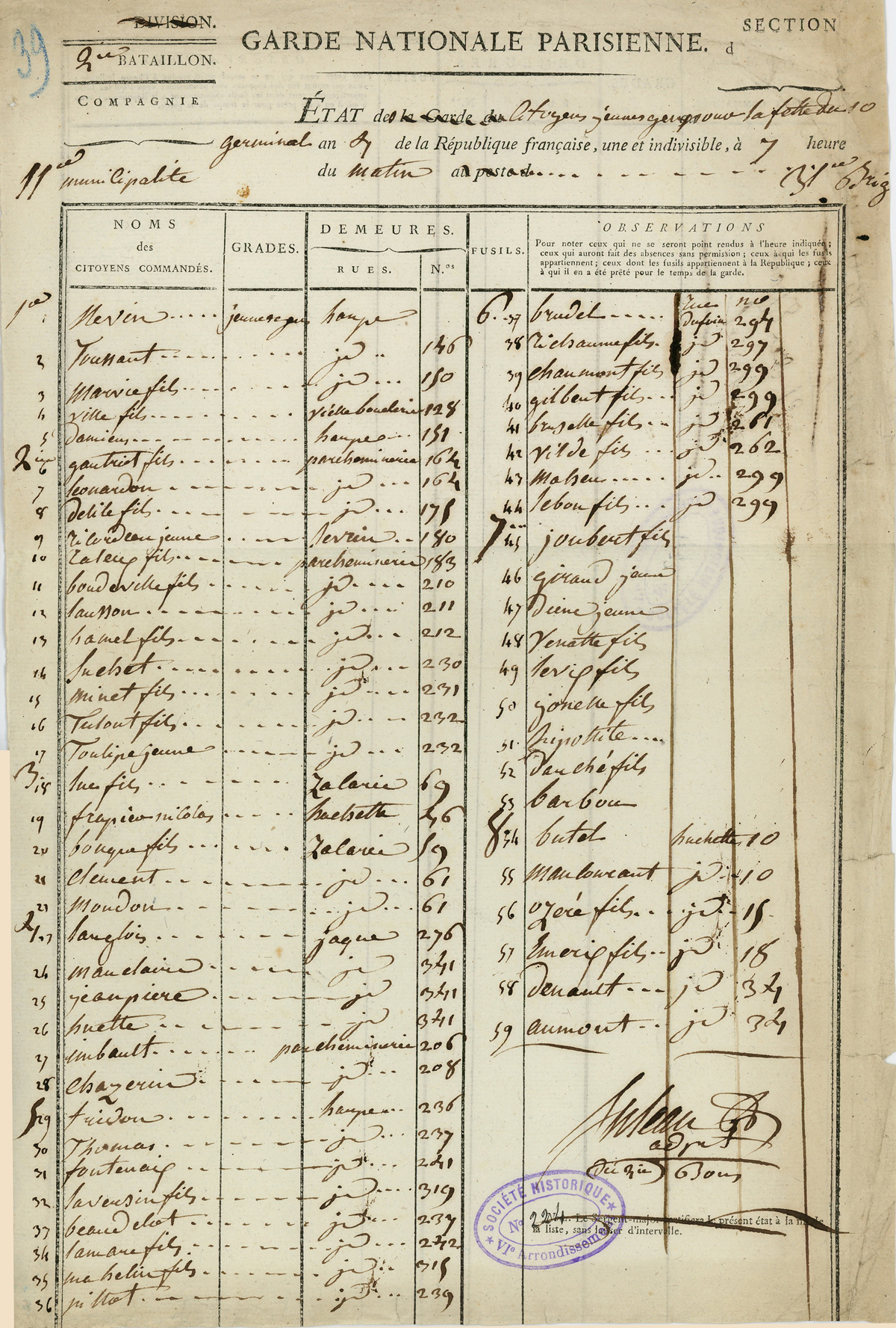 Garde nationale parisienne, 2ème bataillon. « État des citoyens jeunes gens pour la fête du 10 germinal An 7 », convoqués pour 7 heures du matin au 11e Arrondissement. Liste des nos et adresses.