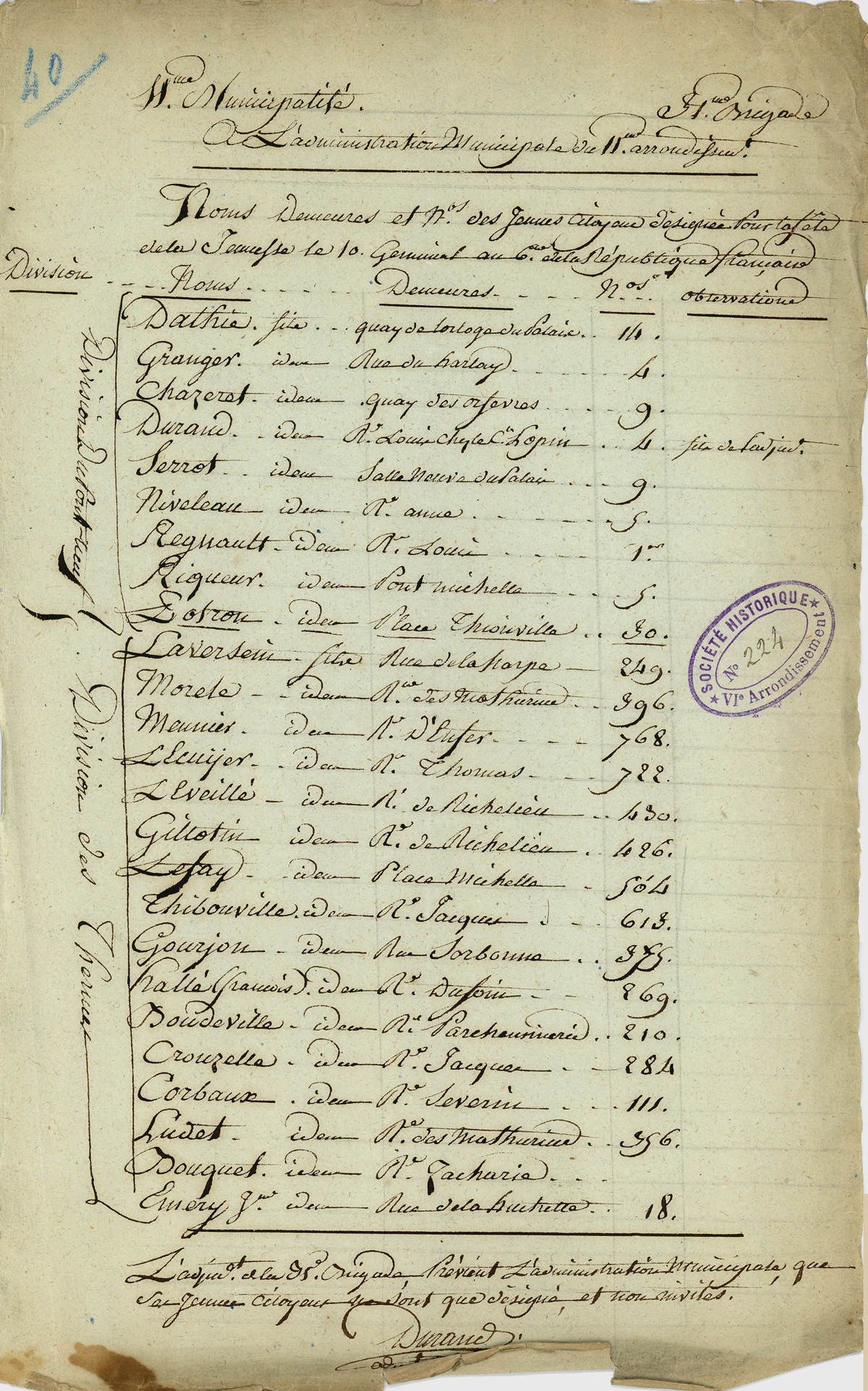 Administration municipale du 11e, 31e Brigade, liste des noms et demeures et numéros des jeunes citoyens désignés pour la fête de la jeunesse le 10 germinal An 6. Document signé par Durand. Elle précise que les jeunes citoyens ne sont que désignés et non invités.