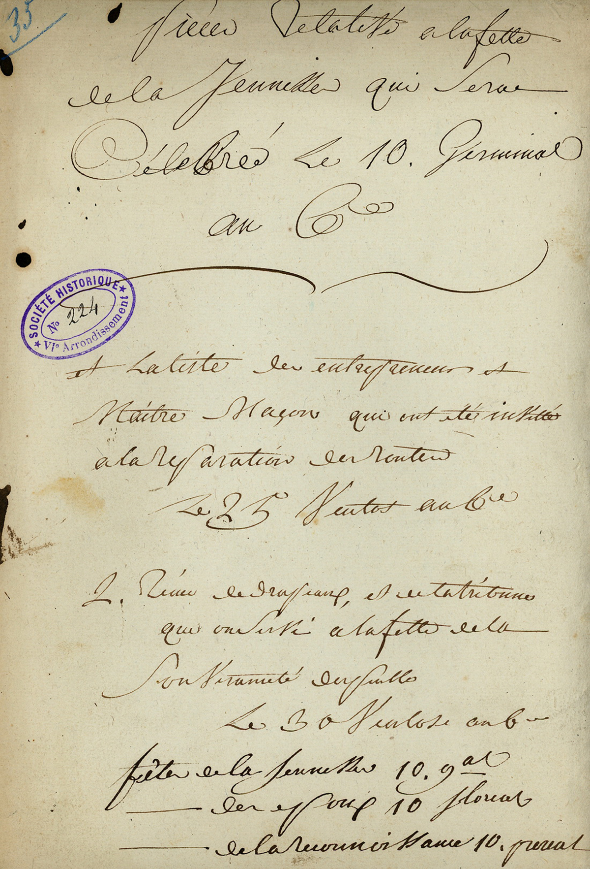 Pièce relative à la fette (sic) de la jeunesse qui sera célébrée le 10 germinal An 6. Cette pièce introduit la liste des maîtres maçons invités à effectuer des réparations, et autres corps de métiers, le 25 ventôse An 6.