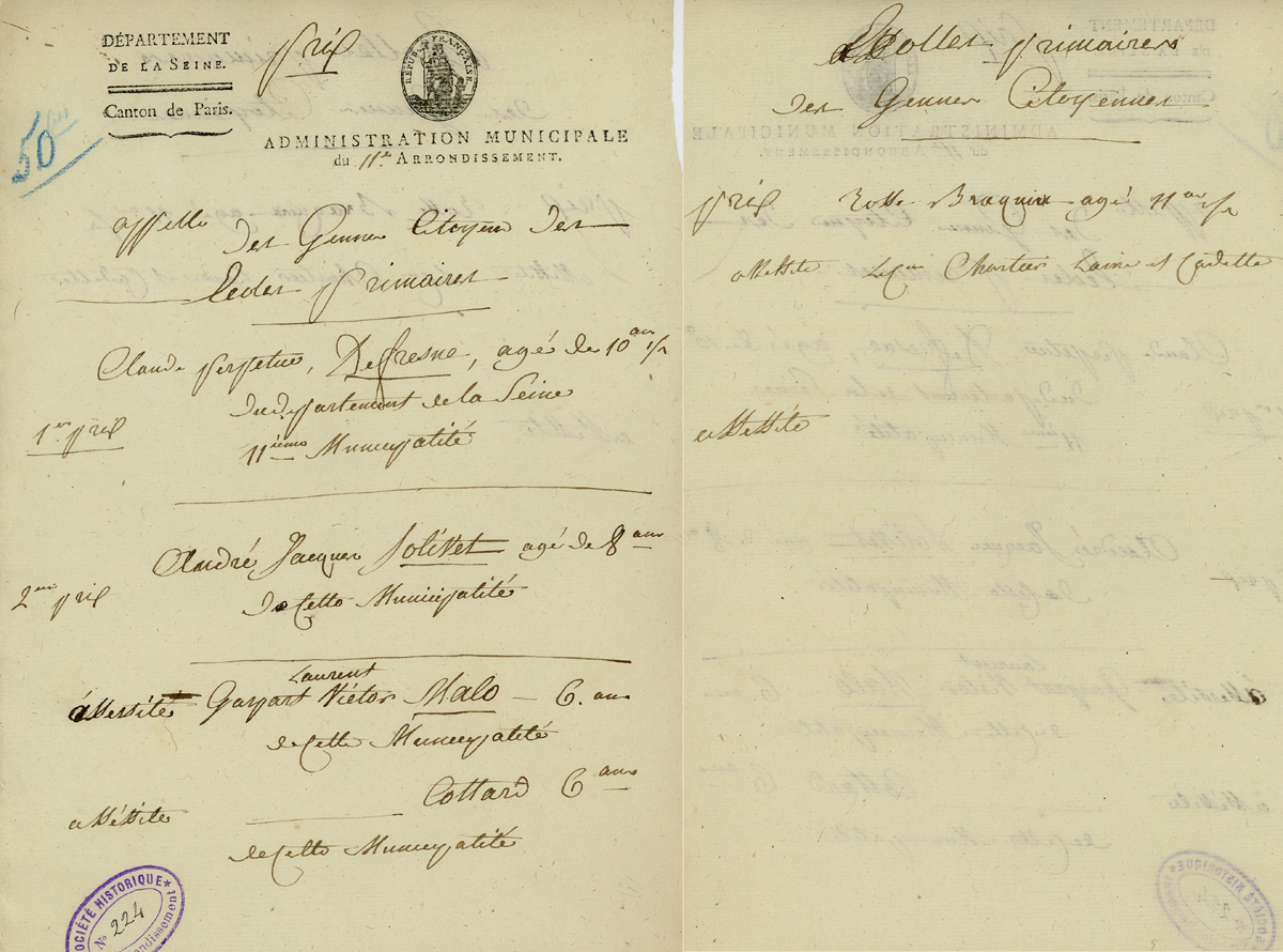 Administration municipale du 11e, appel des jeunes citoyens des écoles primaire (liste des élèves), pour remise des prix et accessits. Sans date. Probablement de l’An 7 au vu des âges des élèves déjà cités pour des récompenses en l’An 6.