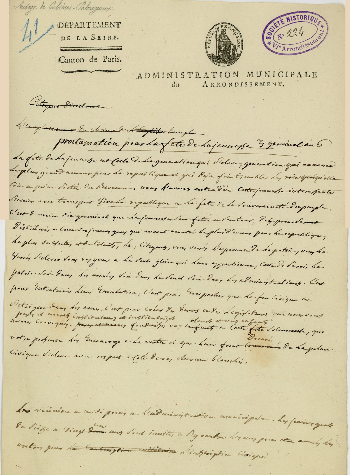 Administration municipale du 11e, 3 germinal An 6, proclamation pour la fête de la jeunesse.
