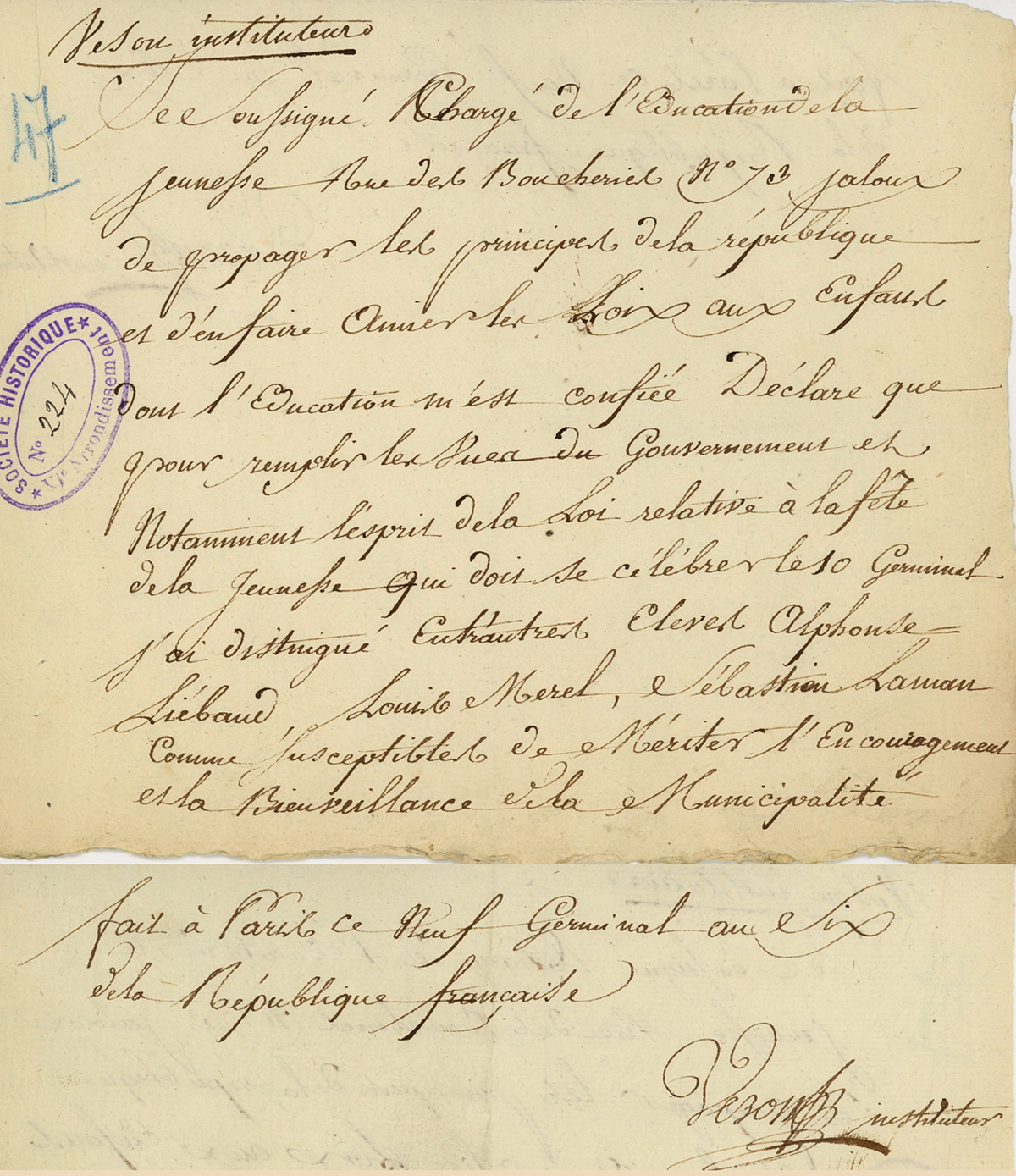 Lettre du 9 germinal An 6, adressée à l’Administration municipale du 11e, signée par l’instituteur Veson, « chargé de l’éducation de la jeunesse rue des Boucheries N+ 73 jaloux de propager les principes de la république et d’en faire aimer les loix aux enfants », dans laquelle il recommande trois élèves en vue de la fête de la jeunesse du 10 germinal : Alphonse Liébaud, Louise Merel, Sébastien Laman (?).