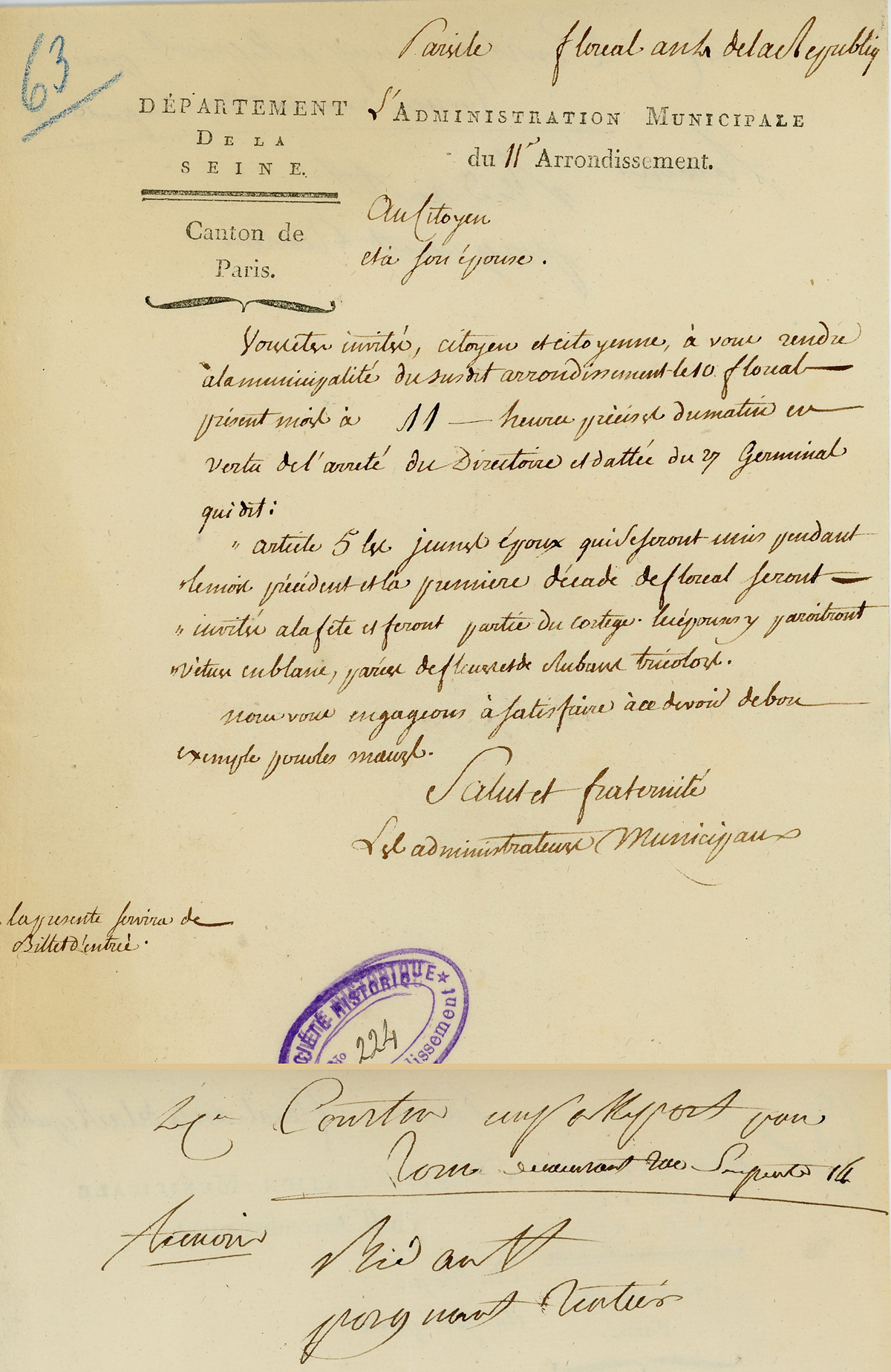 Lettre manuscrite à entête de l’Administration municipale du 11e, servant de billet d’entrée, adressée probablement au Sieur Courtin demeurant au 14 rue Serpente, l’« invitant » (en fonction de l’arrêté du directoire du 27 germinal), à se rendre à la municipalité le 10 floréal (An 6 ?). Cet arrêté précise dans son article 5 que « les jeunes époux qui seront unis pendant le mois précédent et la premiere decade de floreal seront invités a la fête et feront partie du cortege. Les époux y paroitront vétus en blanc, parés de fleurs et de rubans tricolores (sic) ».