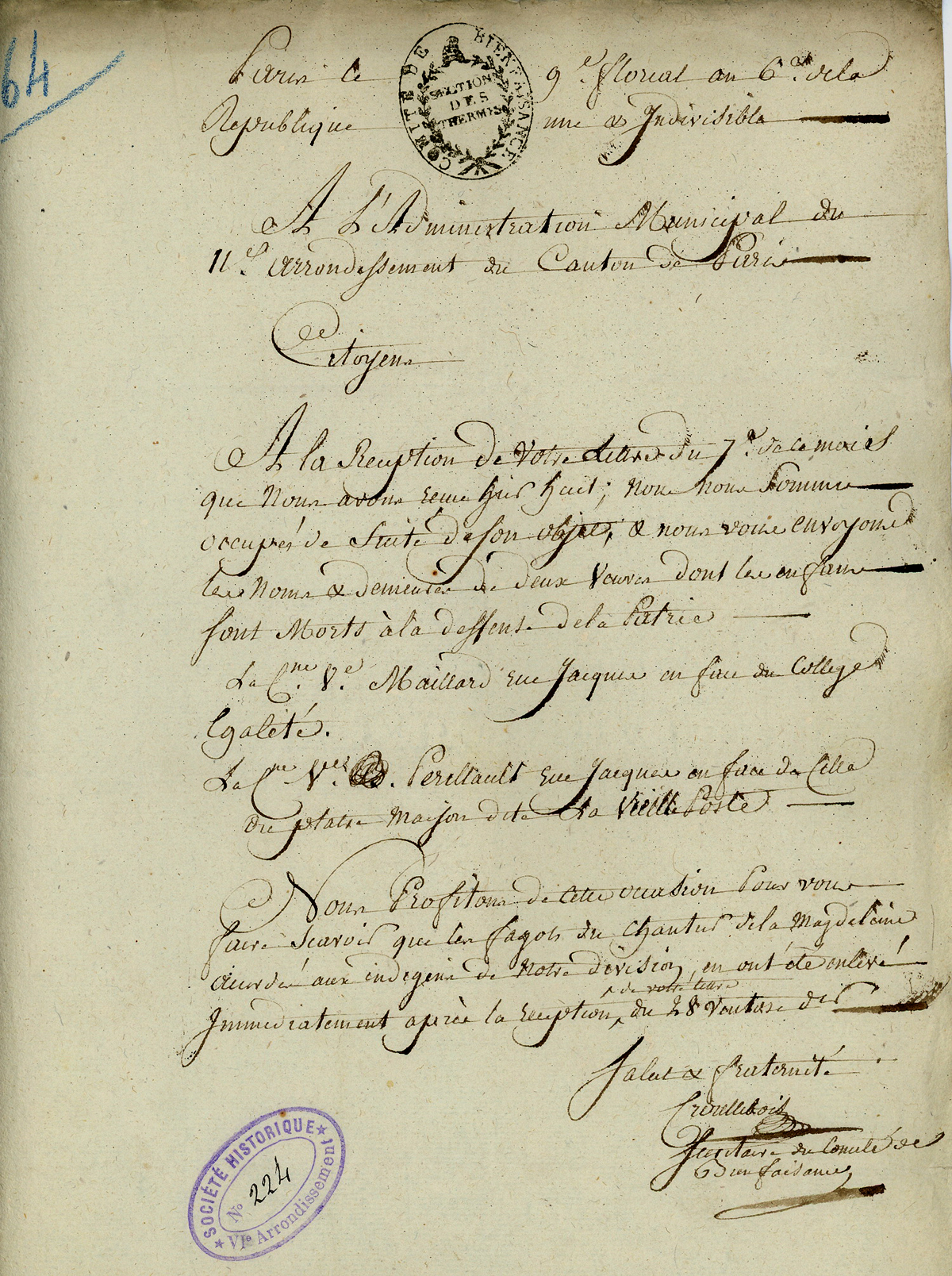 Lettre du 9 floréal An 6, du secrétaire du comité de bienfaisance, Troullebois (?), adressée à l’Administration municipale du 11e, et qui leur recommande deux veuves ayant eu leurs enfants morts pour la défense de la patrie : sont citéesla veuve Maillard demeurant rue Jacques en face du collège Égalité, et la veuve Periltault (?) demeurant rue Jacquesde la maison de la vielle poste.
