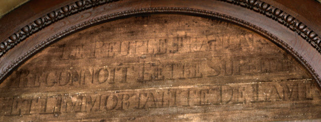 Le fronton de la porte centrale de l’église, sur lequel on distingue, difficilement, l’inscription en question.